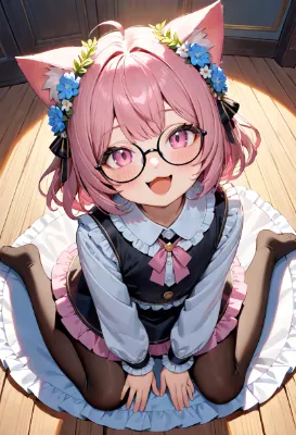masterpiece, best quality, extremely detailed, absurdres, highres, ultra detailed, a goddess girl, 8yo, kawaii, (eyeglasses:1.2), pink hair and pink eyes, cute goddess long dress, rainbow color gradation dress, arms up, holding a big prism, emitting gradation rainbow light from prism, backlighting, in fantasy world