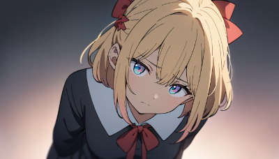 1girl, blonde hair, blue eyes, short hair, hair bow, red bow, anime style, loli, taking an eye test, squinting with a confused expression, covering one eye with an occluder, detailed indoor setting, eye chart in the background, gentle color palette, hair bow, red bow, (squinting:1.2), (confused expression:1.3), (blue eyes:1.1), (short hair:1), (occluder:1.2), masterpiece, best quality, very aesthetic, absurdres, best quality, amazing quality, very aesthetic, absurdres