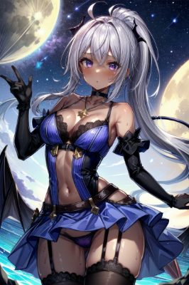 masterpiece, best quality, extremely detailed, anime, girl, skirt, a pretty woman, ponytail, ahoge, garter belt, silver hair, purple eyes, dancer, demon, fantasy, colorful, different world, sea, summer, starry sky, full moon, panty shot, blushing, cool <lora:hairdetailer:1> <lora:kasshokuhada:1> ,