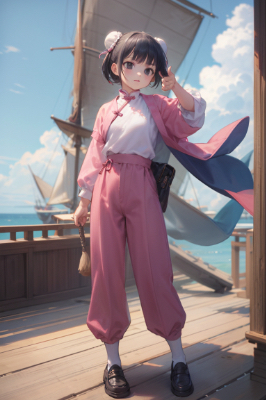 standing, (thumbs up), blue sky, sea, medieval sailing ship, on ship deck, middle age, Age of Discovery, middle age <lora:hairdetailer:1> <lora:yawanuri:1>