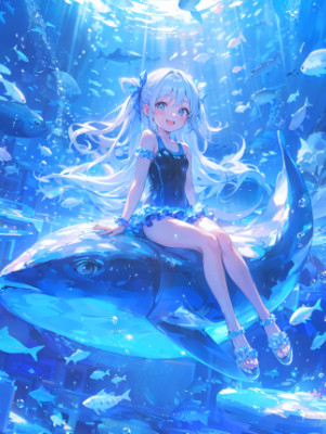 海の中を泳ぐ大きな魚の背に乗った女の子と色鮮やかな熱帯魚たちを作ってみました。