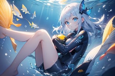 masterpiece, best quality, super fine illustration:1.5), illustration, CG, 2D, complicated, extremely detailed 1 girl, from above, extremely detailed face, closed eyes, own hugging legs, shoal of fish, Drifting underwater, transparent water