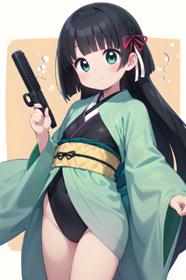 1 girl,(((very longest hair))),black hair, smile,straight Hair,hair ribbon,mintgreen stripe,Black Eyes,flat chest,straight Across bangs,princess Cut, Very Long Sideburn,roundry Head,Droping eyes,cute,Meekness,Bob Cut,long back hair,12 years Old, kimono,swimsuit,Ice