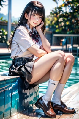 (SFW:1.4), (masterpiece, best quality, awesome extremely realistic, high resolution, 8K:1.3), 1girl, solo, black long hair, bangs, (tsurime:1.6), closed mouth, light smile, blush, hand on own face, ,looking at viewer, plaid bow, school uniform, shirt, plaid skirt, white short sock, brown loafers, unmoving pattern, full body, classroom, standing against of window, head tilt