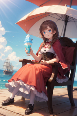 masterpiece, best quality, extremely detailed, anime, full body shot, a girl, high teen, princess, young lady, beautiful girl, Germanic, fair skinned, smile, happy, long hair, blonde hair, spiral curl hair, putting blue ribbon on her hair, green eyes, tareme, droopy eyes, classic princess dress, light blue colored dress, ruffle dress, sitting in a chair, (holding a spoon), (a bowl with light blue colored shaved ice on the white table), rococo style parasol, blue sky, strong sunlight, beach, caribbean, tropical, middle age, Age of Discovery, middle age <lora:hairdetailer:1> <lora:yawanuri:1>