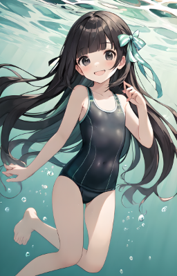 1 girl,(((very longest hair))),black hair, smile,straight Hair,hair ribbon,mintgreen stripe,Black Eyes,flat chest,straight Across bangs,princess Cut, Very Long Sideburn,roundry Head,Droping eyes,cute,Meekness,Bob Cut,long back hair,12 years Old, kimono,swimsuit,weapon