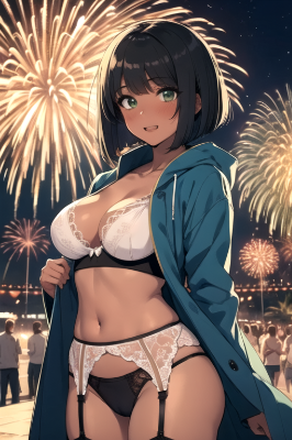 masterpiece, best quality, extremely detailed, anime, girl, skirt, Fireworks display, a pretty woman, ponytail, black hair, black eyes, ojou-sama, colorful, summer, night sky, night view, summer festival, fireworks, happy, smiling <lora:hairdetailer:1> <lora:kasshokuhada:0.75> ,