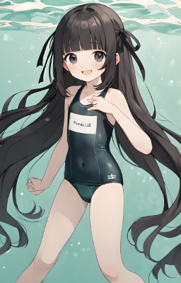 1 girl,(((very longest hair))),black hair, smile,straight Hair,hair ribbon,mintgreen stripe,Black Eyes,flat chest,straight Across bangs,princess Cut, Very Long Sideburn,roundry Head,Droping eyes,cute,Meekness,Bob Cut,long back hair,12 years Old, kimono,swimsuit,Fireworks display