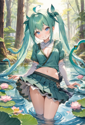 masterpiece, best quality, extremely detailed, anime, girl, skirt,hatsunemiku,fantasy,snake,blue eyes,blue hair,green hair,mini skirt,twintail,longhair,ahoge,watercolor,Japanese style,forest,lotus,water,smile,clear sky,spring,shrine maiden