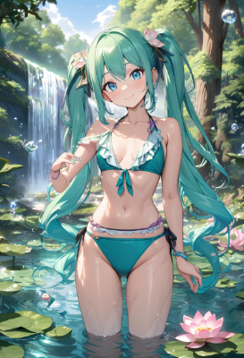 masterpiece, best quality, extremely detailed, anime, girl, ,hatsunemiku,fantasy,blue eyes,blue hair,green hair,mini ,twintail,longhair,forest,lotus,water,smile,clear sky,spring,flower,waterfall,bikini swimwear,snake,Soap bubble,aqua