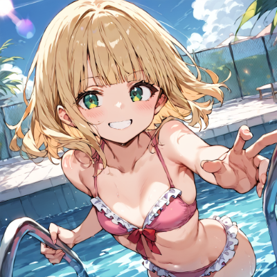 pool, frilled pink bikini, smile, action pose, lens flare