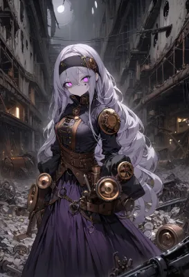 masterpiece,best quality,extremely detailed,steampunk,Dark Spirits,ominous,1girl,silver longhair,purple eyes,Circles under the eyes,headband,Crying,Abandoned factory,Pile of scrap iron <lora:hyperdetailer_v060.safetensors:1> <lora:saturation:1>