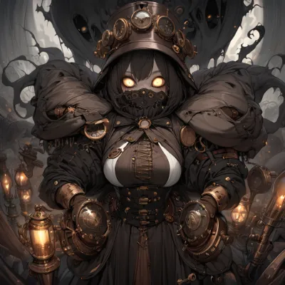 少し前に闇精霊のスチームパンクをやってから何となく想像して生成してみた。物語風に言うなら 「閉鎖して長い年月が経ち、廃墟となった工場に現れる少女。工場が閉鎖して暫くしてから現れるようになった少女の容姿はその頃から変わらず、廃墟をさまよっている」 みたいな感じかな。浅い言葉で申し訳ない
