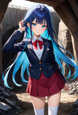 masterpiece, best quality, extremely detailed, high resolution, beautiful face, Japanese anime,1girl, (cowboy shot:1.3), ((no hat:1.3)), BREAK ((red colored hair:1.3)), ((very short hair:1.2)), (hairs between eyes), BREAK ((red colored hair:1.3)), BREAK(coral red eyes), (tsurime, with eyelashes), (beautiful detailed eyes:1.2), (tanned skin:1.5), (squinting), 14 -year-old ,154cm tall, Slender, small breasts, original character, fantasy, BREAK ((beautiful fingers:1.3)), BREAK ((coal mine background:1.3)), BREAK (standing:1.4), BREAK((dark purple, blazer:1.3)), (red rebbon), (Plaid, red skirt:1.3), BREAK(white socks:1.3), shoot from front, looking at viewer