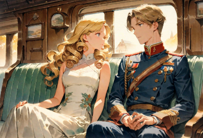 masterpiece, best quality, extremely detailed, nostalgia, fantasy, watercolor, couple sitting side by side in a Train seats (steam locomotive), night, looking at each other (looking away: 1.5), military uniform, one-piece dress, (((Close eyes))), sweet kiss, smile, Art Deco