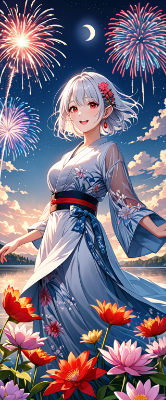 8K,(((masterpiece,best quality,Ultra extremely detailed,perfect anatomy,detailed))),(wave print, see-through transparency sleeve_tight_dress_wear),white hair,(detailed_red_eyes),((detailed_red_ eyes)),(open mouth:1.2),open eyes wide,smile,blush,full lips,(looking at viewer),big hip,(one beautiful female detailed elf),(from above, lying on water),solo,(bob_cut_hair:1.5),shiny skin,hair band,(white_bob_cut_hair),flower floating,star veil,shooting star,big clouds,(huge big moon),flying_flowers,shooting stars,wave shining white hair,BREAK,huge stars,mirror_lake,<lora:hairdetailer:0> <lora:make25d_type1_v100:1>,,,,
