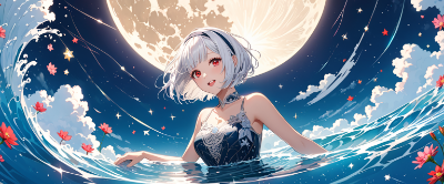 8K,(((masterpiece,best quality,Ultra extremely detailed,perfect anatomy,detailed))),(wave print, see-through transparency Leather_Bodysuit_dress),white hair,(detailed_red_eyes),((detailed_red_ eyes)),(open mouth:1.2),open eyes wide,smile,blush,full lips,(looking at viewer),big hip,(one beautiful female detailed elf),(from above, lying on water),solo,(bob_cut_hair:1.5),shiny skin,hair band,(white_bob_cut_hair),flower floating,star veil,shooting star,big clouds,(huge big moon),flying_flowers,shooting stars,wave shining white hair,BREAK,huge stars,cafe,<lora:hairdetailer:0> <lora:make25d_type1_v100:1>,,,,,,