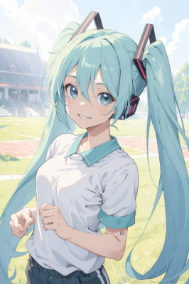 ((masterpiece)), ((high resolution)), ((best quality)), (ultra-detailed), anime, ((extremely detailed)), 4K, (8K), best quality, dynamic angle, (beautiful), solo, (hatsune miku), (yukata), smile, outdoors,