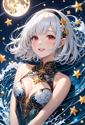 8K,(((masterpiece,best quality,Ultra extremely detailed,perfect anatomy,detailed))),(wave print, see-through transparency Leather_Bodysuit_dress),white hair,(detailed_red_eyes),((detailed_red_ eyes)),(open mouth:1.2),open eyes wide,smile,blush,full lips,(looking at viewer),big hip,(one beautiful female detailed elf),(from above, lying on water),solo,(bob_cut_hair:1.5),shiny skin,hair band,(white_bob_cut_hair),flower floating,star veil,shooting star,big clouds,(huge big moon),flying_flowers,shooting stars,wave shining white hair,BREAK,huge stars,cafe,<lora:hairdetailer:0> <lora:make25d_type1_v100:1>,,,,,,,
