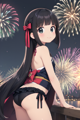 1 girl,(((very longest hair))),black hair, smile,straight Hair,hair ribbon,mintgreen stripe,Black Eyes,flat chest,straight Across bangs,princess Cut, Very Long Sideburn,roundry Head,Droping eyes,cute,Meekness,Bob Cut,long back hair,12 years Old, kimono,swimsuit,peace