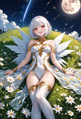 8K,(((masterpiece,best quality,Ultra extremely detailed,perfect anatomy,detailed))),(batterfly print, see-through transparency gold Leather_Bodysuit_dress),white hair,(detailed_red_eyes),((detailed_red_ eyes)),(open mouth:1.2),((almost close eyes)),smile,blush,full lips,big hip,(one beautiful female detailed elf),(from above, lying on grass),(with white big wings),solo,(bob_cut_hair:1.5),((shiny skin)),hair band,(white_bob_cut_hair),flower floating,star veil,shooting star,big clouds,(huge big moon),flying_flowers,shooting stars,wave shining white hair,BREAK,huge stars,cafe, <lora:hairdetailer:0.95> <lora:make25d_type1_v100:1> ,,
