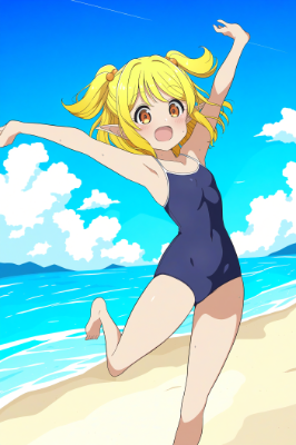1 cute girl wearing small yellow puffy small life vest, two side up, blonde hair, short hair, orange bobbles, elf ears, orange eyes, {{{{{conpetitive school swimsuit}}}}}, the life vest is buckled, flat chest, barefoot, running pose, clear sky, beach, anime drawings, anime coloring, best quality, amazing quality, very aesthetic, absurdres