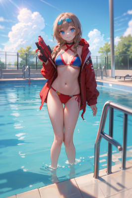 お題の「プール」にちなみ、時代設定的に本来はないシチュエーションですが、拙著に登場する女子キャラ達がプールで遊ぶシーンを、それぞれのキャラをイメージしたビキニ姿で作成。 こちらは大航海時代風世界を舞台にした海洋冒険ファンタジー小説 『El Pirata Del Grimorio ~魔導書の海賊~』 (※下記URL参照) の主要キャラの海賊の一人、東方人のカンフーロリ少女、陳露華(チェンルゥファ)。 プールの中でもカンフーです。 ほんとは飛び蹴りをしてほしかったのですが、出てくれなかった……(;´д`)