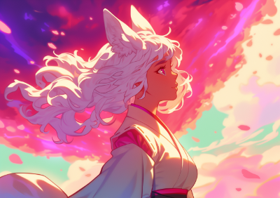 crayon drawing, silent happy, daydream, crystal art, huge stress, stress world, path towards hole, dawn of the cold, curiosity bells the statue, killer queen, beautiful cute dark-skinned girl, japanese miko clothes, silk texture, black undershirt, white hair, fox ears, thick eyebrows, sideway glance, imaginary lighting, colorful background, --ar 24:17 --niji 6