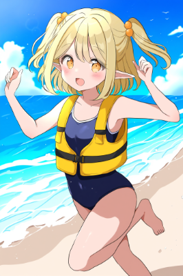 One cute girl, two side up, blonde hair, short hair, orange bobbles, elf ears, orange eyes, white headband, gym uniform, red shorts, high-waisted shorts, flat chest, standing, standing, white sports shoes, white socks, outdoor, schoolyard, anime coloring, anime drawings, best quality, amazing quality, very aesthetic, absurdres