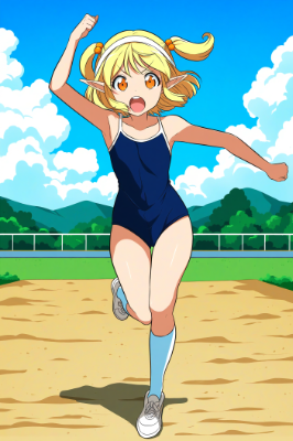 One cute girl, two side up, blonde hair, medium hair, orange bobbles, elf ears, orange eyes, pom-poms, competitive school swimsuit, blue skirt, pleated skirt, high-waisted skirt, flat chest, white socks, sports shoes, standing, anime coloring, best quality, amazing quality, very aesthetic, absurdres