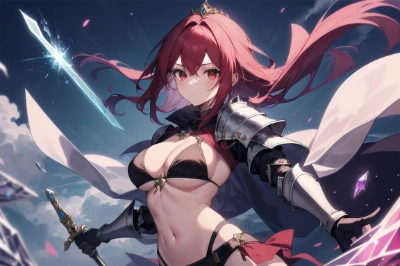 1girl, solo, long hair, breasts, bangs, red eyes, long sleeves, cleavage, jewelry, very long hair,