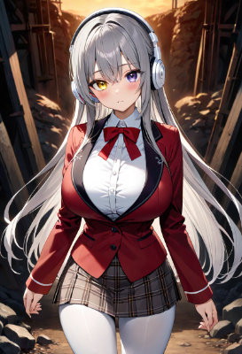 masterpiece, best quality, extremely detailed, high resolution, beautiful face, Japanese anime,1girl, (cowboy shot:1.3), ((no hat:1.3)), BREAK ((two-tone hair, Black hair, White hair:1.3)), ((Long straight hair:1.3)), (hime cut:1.3), (pig tails), BREAK(heterochromia, black eye, white eye), (tareme, with eyelashes), (beautiful detailed eyes:1.2), (with crazy eyes:1.3), grin, smirk, 17 -year-old ,180cm tall, tall stature, Curvy, large breasts, original character, fantasy, BREAK ((beautiful fingers:1.3)), BREAK ((coal mine background:1.3)), BREAK (standing upright:1.4), BREAK((white, front open blazer:1.3)), (brown rebbon), (Plaid, brown skirt:1.3), BREAK(white pantyhose:1.3),shoot from front, looking at viewer
