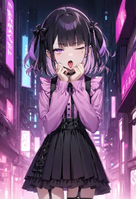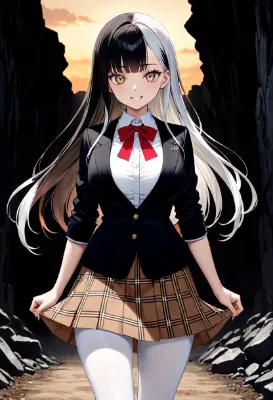 masterpiece, best quality, extremely detailed, high resolution, beautiful face, Japanese anime,1girl, (cowboy shot:1.3), ((no hat:1.3)), BREAK ((Rainbow hair color:1.5)), ((very long hair:1.5)), (asymmetric bangs:1.3), (curl outward hair:1.4), BREAK ((Rainbow hair color:1.5)), (ahoge:1.3), BREAK(rainbow eyes:1.3), (tsurime, with eyelashes), (beautiful detailed eyes:1.2), (sunglasses:1.3), (squinting), (enjoy), smile, 17 -year-old ,175cm tall, Athletic, large breasts, original character, fantasy, BREAK ((beautiful fingers:1.3)), BREAK ((coal mine background:1.3)), BREAK (Slouched Posture:1.4), (Raised Arms:1.3), BREAK(cleavage, Overshirt:1.2), (torn, short denim pants), shoot from front, looking at viewer, chibi, chibi character