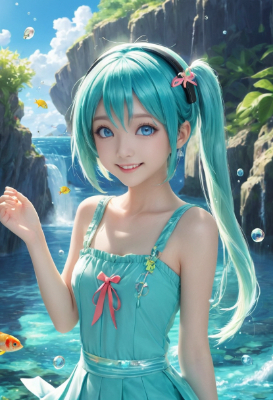 masterpiece, best quality, extremely detailed, anime, girl, ,hatsunemiku,vocaloid,mini ,blue hair,green hair,blue eyes,clear ,twintail,longhair,ahoge,pastelcalla,headphone,Yurukawa,fantasy,waterfall,sun,Crystal Quartz,bikini swimwear,sea,underwater,water bubbles,tropical fish,coral reef,colorful,PastelColor,fish,smile,Bubble