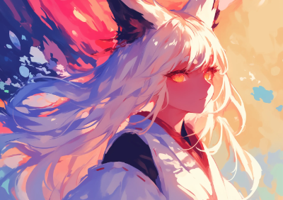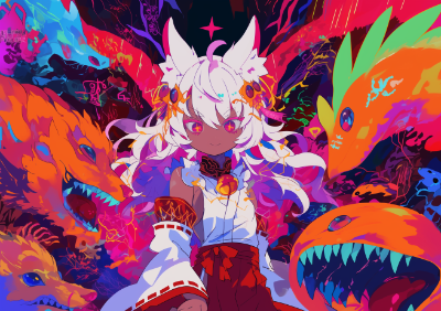 crayon drawing, silent happy, daydream, crystal art, huge stress, stress world, path towards hole, dawn of the cold, curiosity bells flash, killer queen, beautiful cute dark-skinned girl, japanese miko clothes, silk texture, black undershirt, white hair, fox ears, thick eyebrows, sideway glance, imaginary lighting, colorful background, --ar 24:17 --niji 6
