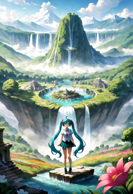 masterpiece, best quality, extremely detailed, anime, girl, skirt,hatsune miku,vocaloid,mini skirt,blue hair,green hair,blue eyes,twintail,longhair,ahoge,Mountain,fantasy,mountain,forest,flower,ruins,waterfall,mist,smile