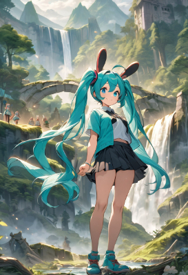 masterpiece, best quality, extremely detailed, anime, girl, skirt,hatsune miku,vocaloid,mini skirt,blue hair,green hair,blue eyes,twintail,longhair,ahoge,Mountain,fantasy,mountain,forest,flower,ruins,waterfall,mist,smile,rabbit