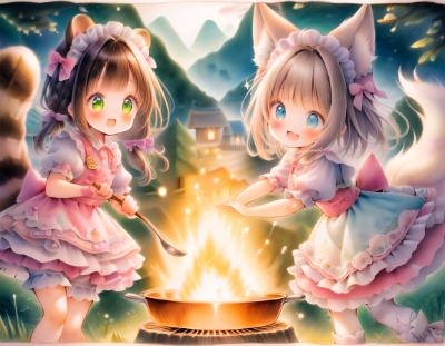 斎藤さんの休暇に渓流へ魚釣りに出掛けた二人です。 やっぱり竿や糸はうまく描画できませんね。 最後の二枚はおかしなものを釣り上げてしまったコン子です。 一番最後は同じseedとPromptで再現できなかったので(PCが不安定だった?)、折角なので少し手直しをしてi2iでアップスケールしておきましたw