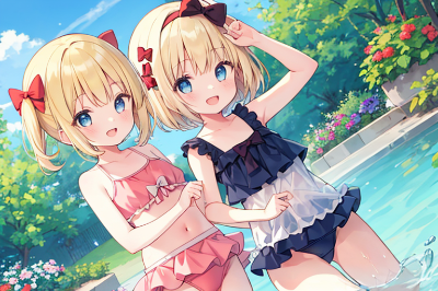 2girls,anime style,blonde hair,blue eyes,short hair,(hair bow:1.3),red bow,black hair,long hair,black eyes,hairband,makeup,applying makeup to each other,cute makeup,kawaii,smiling,happy,closeup,sitting,facing each other,bedroom,vanity mirror,makeup brushes,eyeshadow palette,lipstick,blush,(sparkles:1.2),soft lighting,pastel colors,detailed eyes,rosy cheeks,long eyelashes,heart-shaped pupils,school uniforms,sailor uniforms,ribbons,frills,moe,chibi style,big eyes,small nose,colorful,vibrant,(depth of field:1.1),blurred background,(bokeh effect:1.1),gentle shadows,smooth shading,clean lineart,(masterpiece:1.3),(best quality:1.3),(very aesthetic:1.2),(absurdres:1.2),