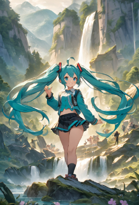 masterpiece, best quality, extremely detailed, anime, girl, skirt,hatsune miku,vocaloid,mini skirt,blue hair,green hair,blue eyes,twintail,longhair,ahoge,fantasy,flower,waterfall,mist,smile,Makeup,bedroom,colorful,macaron,Lollipop