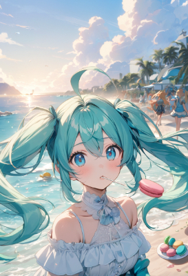 mini skirt,twintail,longhair,ahoge,blue hair,green hair,blue eyes,Makeup,fantasy,colorful,city,clear sky,blue sky,Lollipop,PastelCalla,macaron