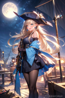 お題の「メイクアップ」にちなみ、普段はノーメイクな拙著に登場する女子キャラ達をメイクアップして、いつもより大人びた感じに作成。 背景もムードがある夜景に。 こちらは大航海時代風世界を舞台にした海洋冒険ファンタジー小説 『El Pirata Del Grimorio ~魔導書の海賊~』 (※下記URL参照) の主要キャラの海賊の一人、赤ずきん風ファッションの少女錬金術師、マリアンネ・バルシュミーゲ。 これまた意外とすんなりうまく生成されました♪