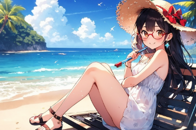 a stylish girl wearing summer dress blowed . She wears light sandals and wears a wide tsub Straw hat. In the background, there is a clear sky and a beach with a gentle wave, express the relaxed summer atmosphere,