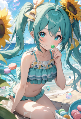 mini ,twintail,longhair,ahoge,blue hair,green hair,blue eyes,fantasy,colorful,clear sky,blue sky,Lollipop,PastelCalla,macaron,vacation,mini ,sea,bikini swimwear