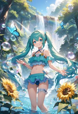 mini ,twintail,longhair,ahoge,blue hair,green hair,blue eyes,fantasy,colorful,clear sky,blue sky,PastelCalla,vaion,mini ,bikini swimwear