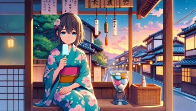 A vibrant festival scene at a traditional Japanese summer festival, featuring a young girl with short black hair wearing a blue yukata adorned with pink and white flowers. She is smiling brightly while holding a small basket with goldfish in one hand. The background is bustling with people in yukatas, warmly lit by rows of hanging lanterns with Japanese characters, creating a lively and festive atmosphere. The goldfish are swimming in a game stall's water tank, and some are jumping out, adding to the lively energy of the scene.