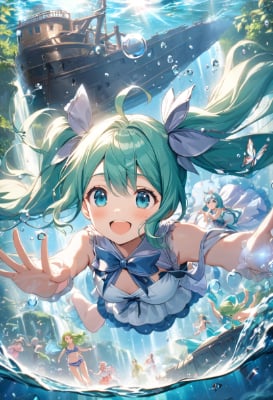 mini ,twintail,longhair,ahoge,blue hair,green hair,blue eyes,fantasy,colorful,clear sky,blue sky,PastelCalla,vaion,mini ,