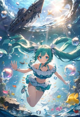 ,bow,swimming,bikini swimwear,sea,underwater,sunken ship,clear ,summer