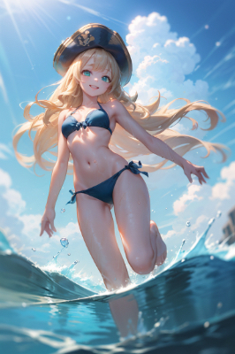お題の「水泳」にちなみ、拙著に登場する女子キャラ達を泳がそうとしたのですが、いくら指示してもぜんぜん泳いでくれない……(;´д`) おかげで生成枚数を無駄に使いまくりました。 ビキニだと水遊びしちゃうのかな? 競泳水着じゃないとだめ? それでも、多少、泳ぎを連想させるような一枚。歩いてますけど? こちらは大航海時代風世界を舞台にした海洋冒険ファンタジー小説 『El Pirata Del Grimorio ~魔導書の海賊~』 (※下記URL参照) のヒロインであるラテン系(スペインがモデル)のおてんばな総督令嬢、イサベリーナ・デ・オバンデス嬢。