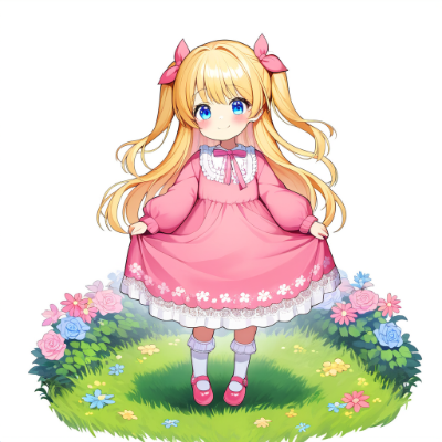 「1人のとても小柄な女性。とても長く明るい金髪、とても長くまっすぐ流れるようなストレートヘアに小さな花飾り。レースの多い白色の長袖のロングワンピースを着て、ピンクのサッシュをつけている。フラワーモチーフのブレスレットをつけている。青い目。顔を赤くして優しく微笑んでいる。花畑に立っている。風が吹いている。スカートを摘んで挨拶している。ピンクの靴。とても詳細な描写。アニメ風」の絵を描いて。